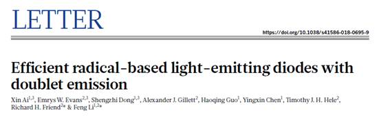 、超分子结构与材料国家重点实验室李峰教授研究团队和剑桥大学卡文迪许实验室(Cavendish Laboratory)Richard H. Friend教授研究团队合作论文“高效双线态自由基发光二极管”(Efficient radical-based light-emitting diodes with doublet emission,Nature, 2018, 563, 536-540),吉林大学为第一完成单位。