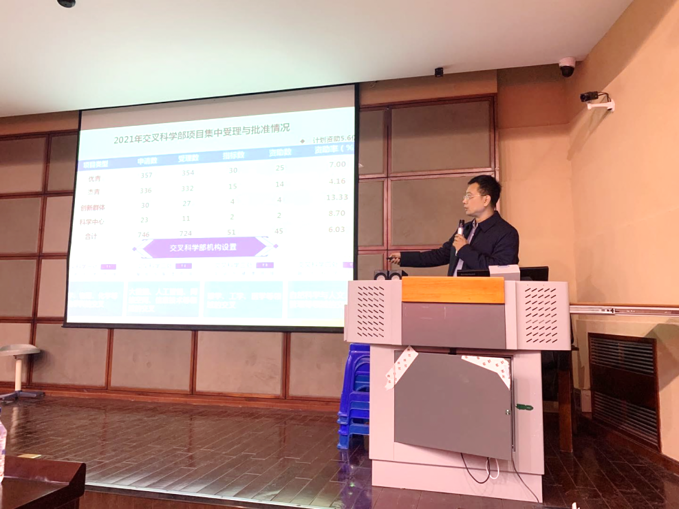 教师可结合自身情况尝试申请基金委交叉科学部的项目,进一步加强化学与医学、生命科学等相关领域交叉融合,产出助力国家经济社会发展的原创性成果。他向在座教师介绍了学校在基金申请及后续辅助指导方面的相关措施,希望通过学校和学院的共同努力,有效提高四虎影视