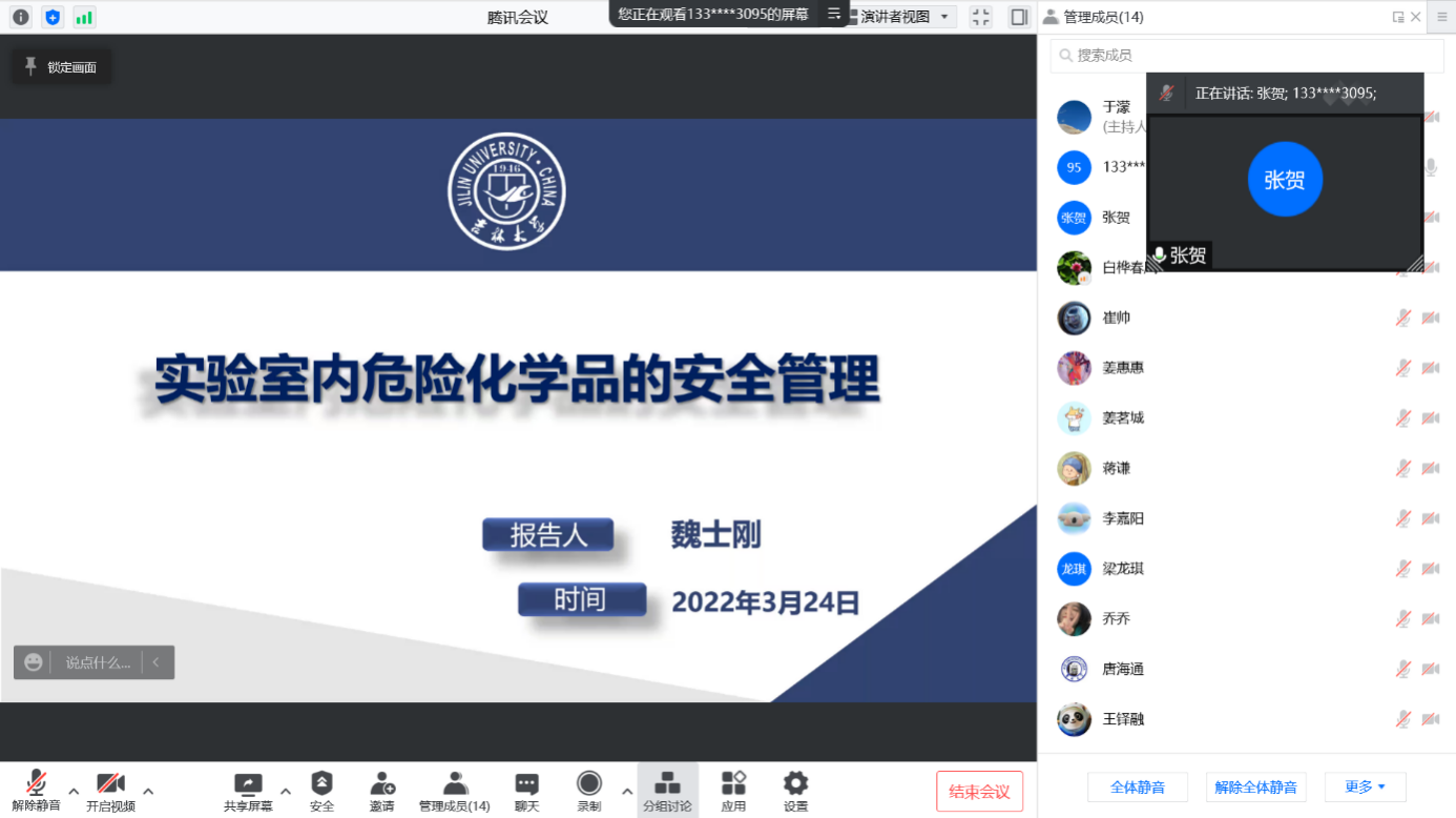为深入贯彻落实习近平总书记关于安全生产重要论述,进一步普及实验室安全知识、加强实验室安全教育,3月24日,吉林大学化学国家级实验教学示范中心副主任魏士刚为学院2021级硕士、博士研究生带来精彩的实验室危险化学品安全管理线上专题讲座。讲座由副院长张贺主持。