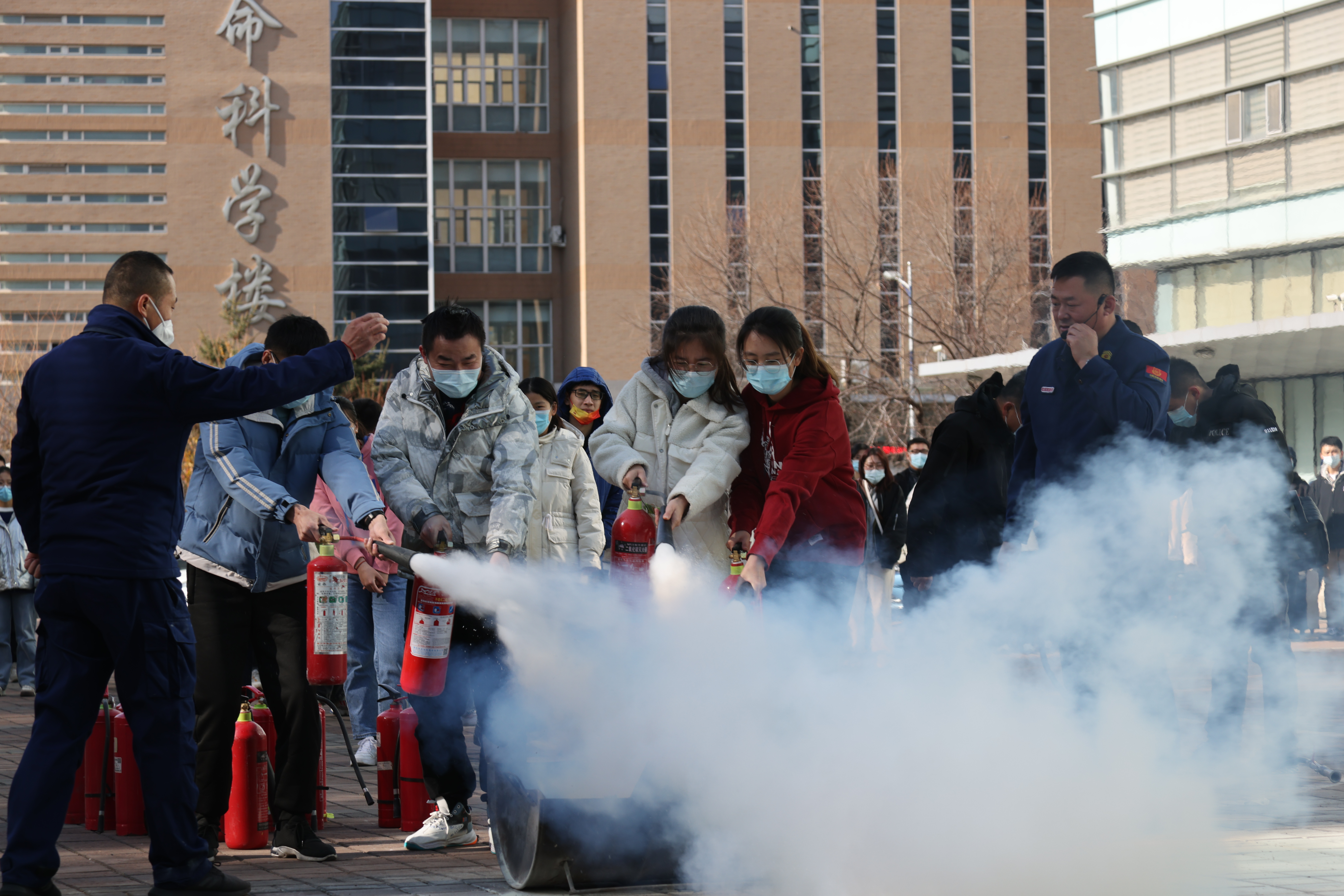 在消防器材实物教学环节,保卫处老师详细讲解并演示了干粉灭火器、二氧化碳灭火器、灭火毯等消防器材,在场学生30余人次参与消防器材的学习和使用。