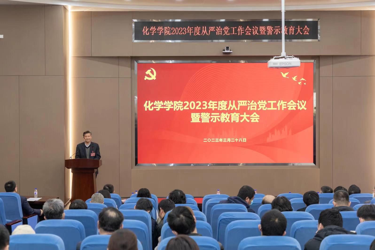 在无机-超分子楼二楼圆形报告厅召开全面从严治党工作会议暨警示教育大会。学院领导班子成员及教职工代表参加了本次会议。会议由学院党委副书记由胜利同志主持。