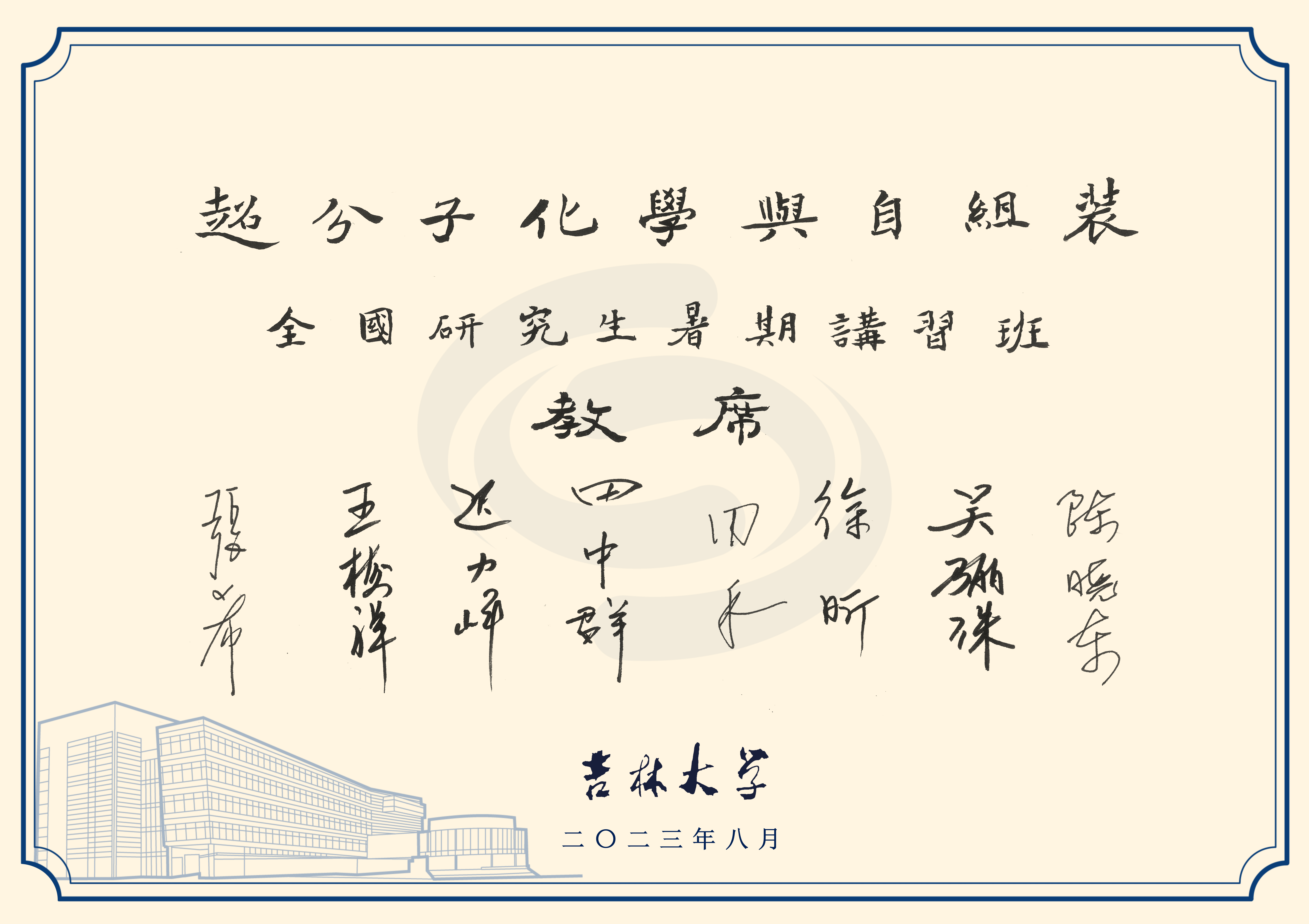 讲习班是吉林大学接续传承的教育教学传统,是学校拔尖创新人才培养工作的重要组成部分。唐敖庆、吴式枢等学校先贤秉承“厚基础、重实践、严要求”教学传统,通过举办讲习班为国家培养了一批又一批各专业领域的优秀人才。本次“超分子化学与自组装” 全国研究生暑期讲习班还是东北六校深化人才培养合作的一次有益尝试。未来,学校将进一步总结经验,积极拓展与国内各兄弟高校和科研院所的合作模式,协同推进高质量人才培养,为教育强国、科技强国、人才强国建设贡献力量。