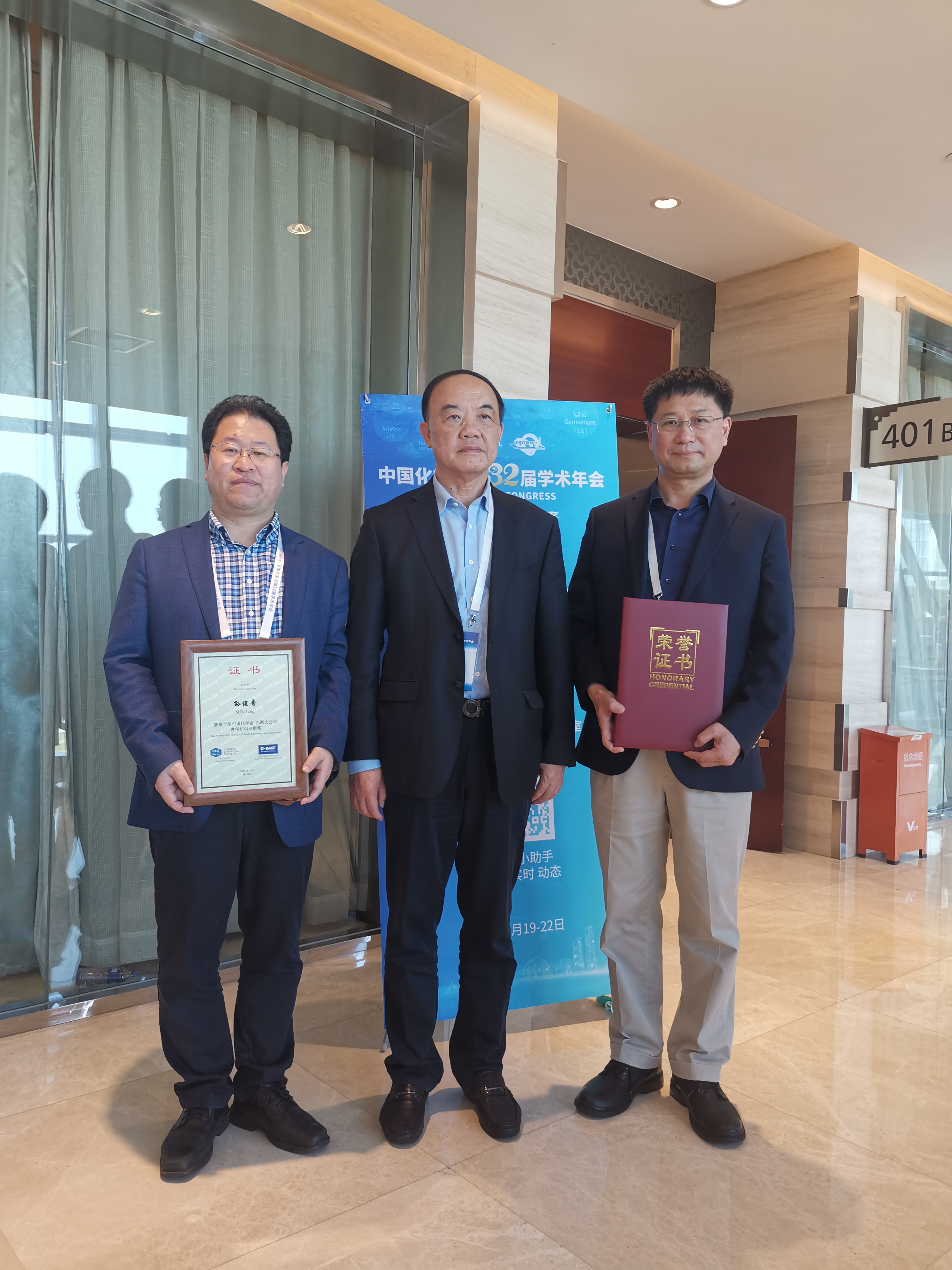 会议期间,吉林大学校长张希院士因在超分子体系的构筑、调控与功能研究方面取得的突出成就,荣获第七届中国化学会——中国石油化工股份有限公司化学贡献奖。在4月19日上午的中国化学会第32届学术年会开幕式上,中国化学会理事长姚建年院士和中国化学会副理事长、中国石油化工股份有限公司科技开发部主任谢在库院士为张希颁奖。