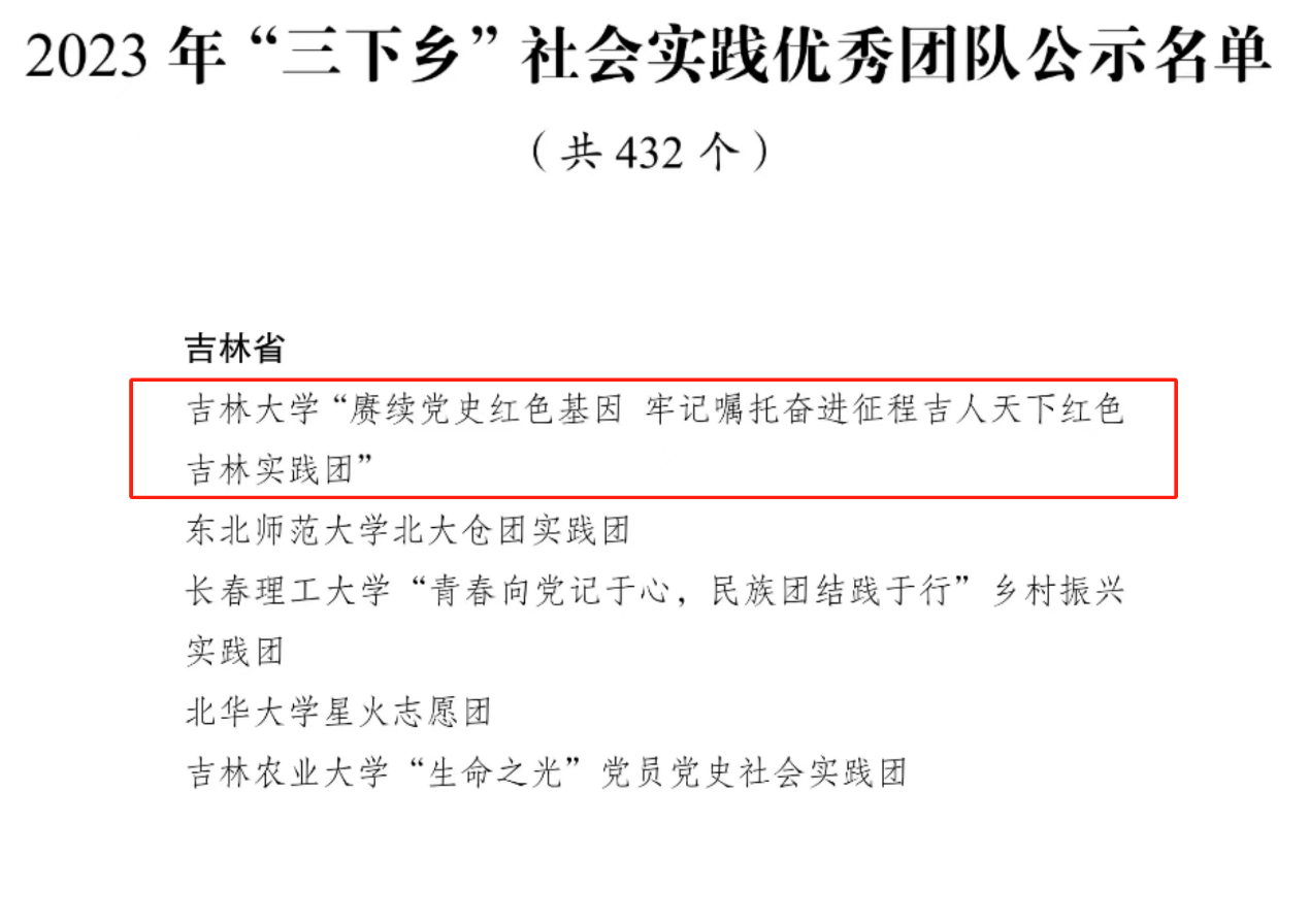 近日,共青团中央公布了2023年“三下乡”社会实践优秀团队名单。我院“吉林大学‘赓续党史红色基因 牢记嘱托奋进征程’吉人天下红色吉林实践团”,荣获2023年全国大中专学生志愿者暑期文化科技卫生“三下乡”社会实践优秀团队。