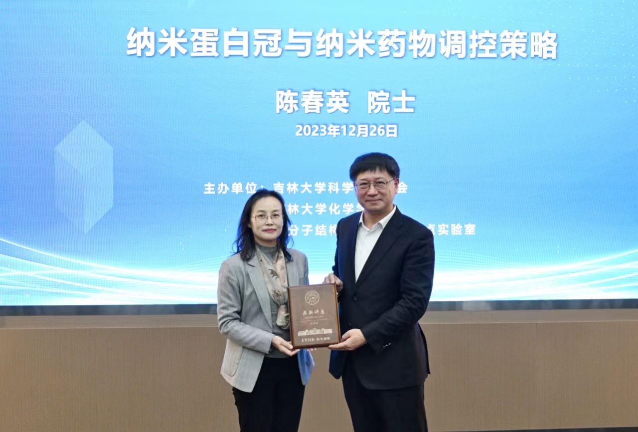 【新闻来源:吉林大学四虎影视 - 四虎影视发布页网站】12月26日上午,中国科学院院士、国家纳米科学中心研究员陈春英做客吉林大学鼎新讲座,以“纳米蛋白冠与纳米药物调控策略”为题,为吉大师生带来了一场精彩的学术讲座。中国科学院院士、吉林大学校长张希出席讲座并为陈春英颁发“鼎新讲座纪念牌”。超分子结构与材料国家重点实验室主任孙俊奇主持讲座。
