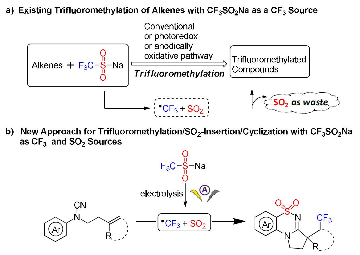 三氟甲基取代的有机氟化合物在医药、农药、材料等领域具有广泛应用。因此,发展高效、实用的合成方法制备三氟甲基取代的有机化合物具有重要的研究价值。Langlois试剂(CF3SO2Na)作为一类重要的三氟甲基化试剂,广泛用于烯烃、芳烃等的三氟甲基化反应。然而,该类试剂仅作为三氟甲基给体,反应伴随释放的SO2作为反应废弃物,并未被有效利用。近日,寮渭巍教授课题组通过电化学方式,首次实现了Langlois试剂作为三氟甲基及二氧化硫给体与N-芳基氰胺反应,通过三氟甲基化/SO2插入/串联环化原子经济性的合成了三氟甲基取代的磺内酰亚胺衍生物。