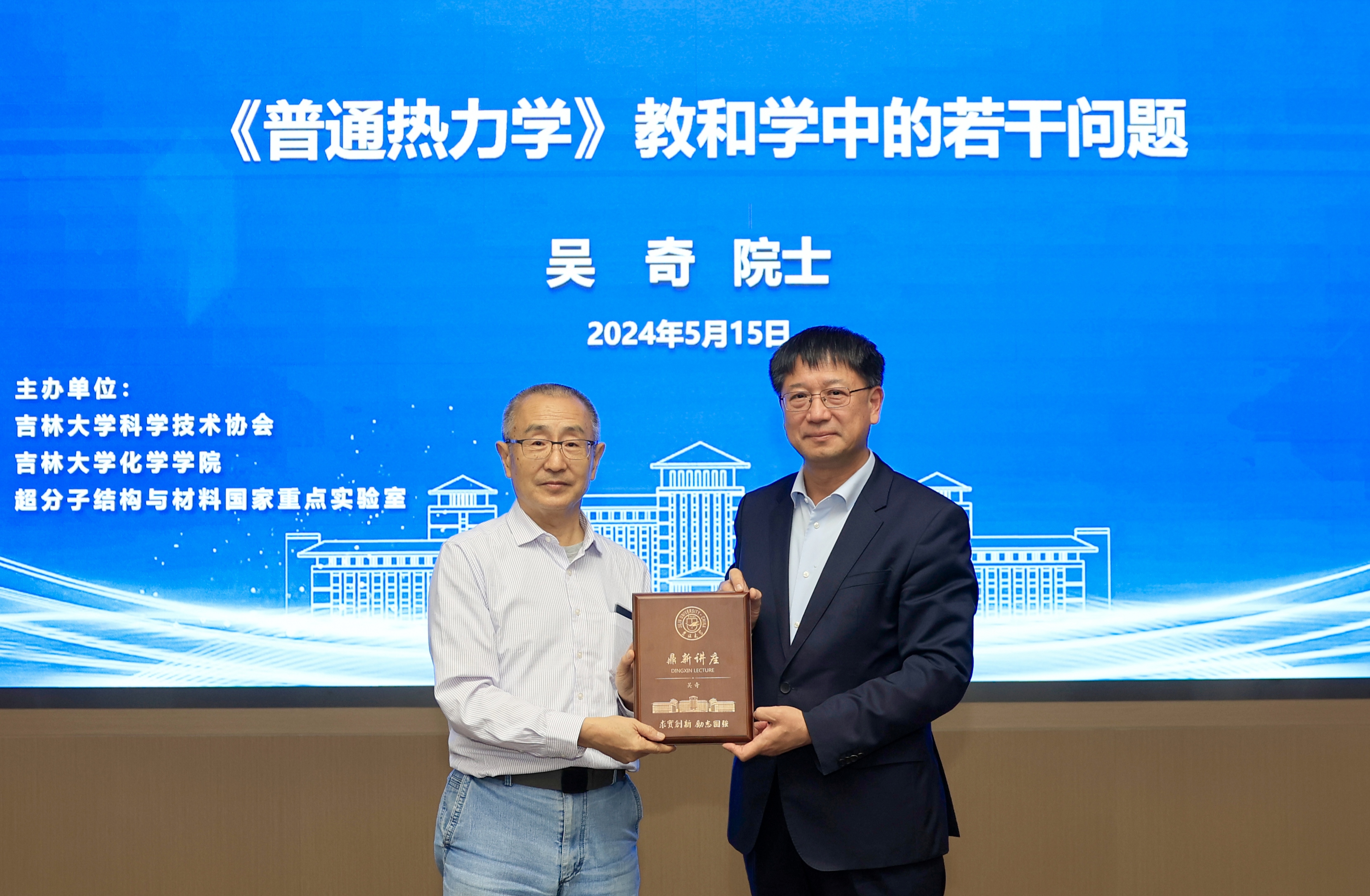 【新闻来源:吉林大学四虎影视 - 四虎影视发布页网站】5月15日晚,中国科学院院士、美国物理学会会士、深圳大学食品科学与加工中心主任、香港中文大学伟伦化学荣休讲座教授吴奇做客吉林大学鼎新讲座,以“《普通热力学》教和学中的若干问题”为题,为吉大师生带来了一场精彩的学术讲座。中国科学院院士、吉林大学校长张希出席讲座并为吴奇院士颁发“鼎新讲座纪念牌”。讲座由四虎影视