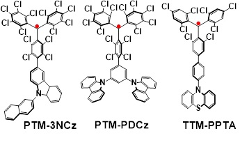 为进一步提高发光自由基的稳定性,在前期研究的基础上,李峰教授研究团队以TTM或PTM自由基为受体(acceptor),以PDCz、PPTA和3NCz等咔唑衍生物作为给体(Donor),得到了一系列给受体结构的自由基PTM-3NCz、PTM-PDCz和TTM-PPTA(如图2所示)。这种给-受体分子结构设计使该类自由基具有反构造原理(anti-Aufbau)的电子结构,从原理上大幅提高了发光自由基分子的稳定性,且保持了高的发光效率。相较于TTM自由基,这种反构造原理的给受体自由基稳定性提高了2-4个数量级。