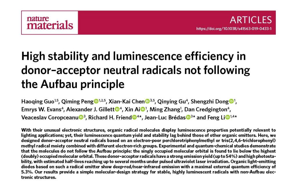 7月22日,《Nature Materials》杂志刊发了吉林大学超分子结构与材料国家重点实验室李峰教授团队、佐治亚理工学院Jean-Luc Brédas教授团队和剑桥大学卡文迪许实验室Richard H. Friend教授团队的合作研究论文“不遵循构造原理的高稳定高发光效率给受体结构中性自由基”(High stability and luminescence efficiency in donor–acceptor neutral radicals not following the Aufbau principle, Nature Materials, 2019, DOI:10.1038/s41563-019-0433-1),吉林大学为第一完成单位。