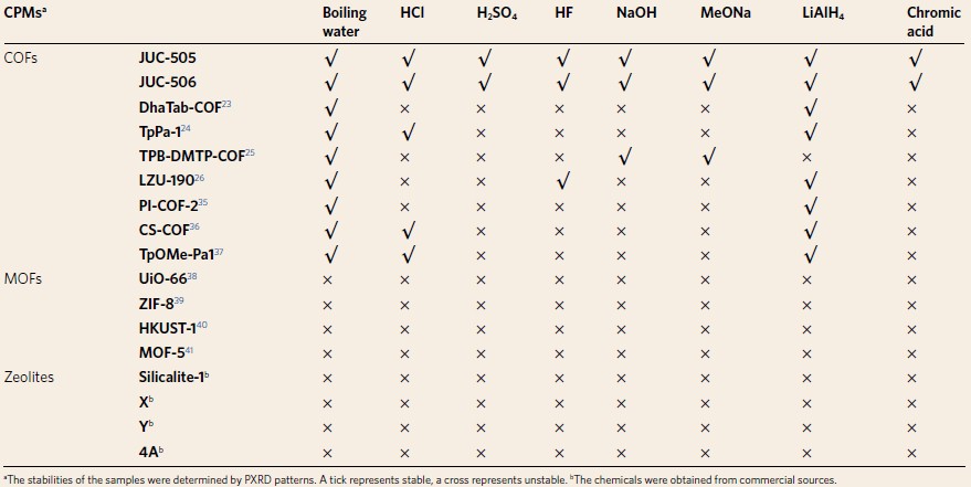 PAE-COFs具有高的结晶度和丰富的孔道结构,同时其能够在包括沸水、强酸(12 M 盐酸,18 M 硫酸,40% 氢氟酸)、强碱(14 M 氢氧化钠,5 M 甲醇钠/甲醇溶液)、强氧化剂(铬酸溶液)、强还原剂(2.4 M 氢化铝锂/四氢呋喃溶液)等苛刻的条件下保持稳定,其稳定性超过了目前所有已知的结晶多孔材料(包括金属-有机骨架材料 (MOFs)、分子筛和其他COFs)。