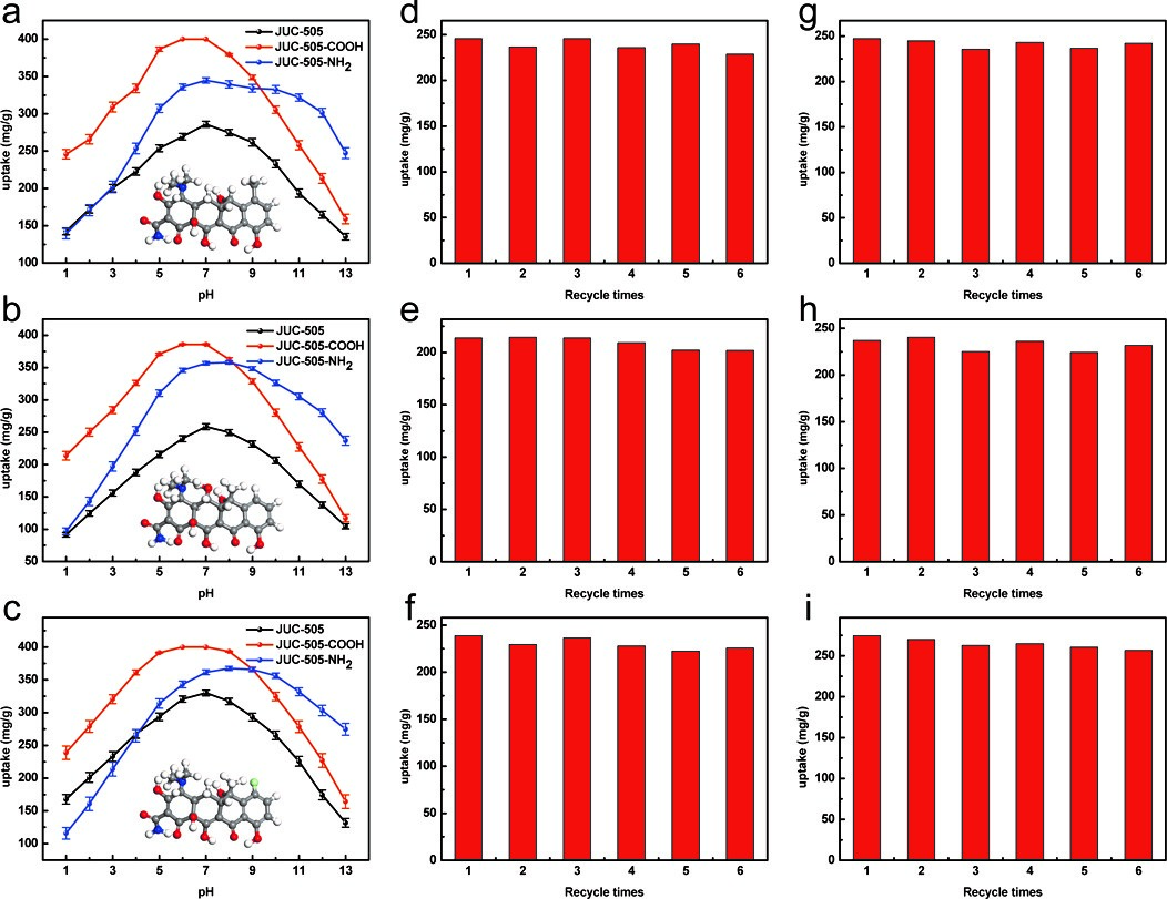 基于JUC-505的高化学稳定性,方老师课题组对其进行了后修饰。通过将JUC-505分别在20%氢氧化钠(水/乙醇=1/1)和2.4 M氢化铝锂(四氢呋喃)中回流,得到了羧基功能化的JUC-505-COOH和氨基功能化的JUC-505-NH2。将JUC-505及其两种衍生物用于污水中抗生素的吸附,发现其对四环素、土霉素和金霉素在广泛的pH范围(pH = 1~13)内具有高的吸附,且经过5次吸附-脱附循环后吸附量没有明显的降低。这意味着这些稳定的COF将是制备可在极端化学环境下使用的功能材料的理想平台。