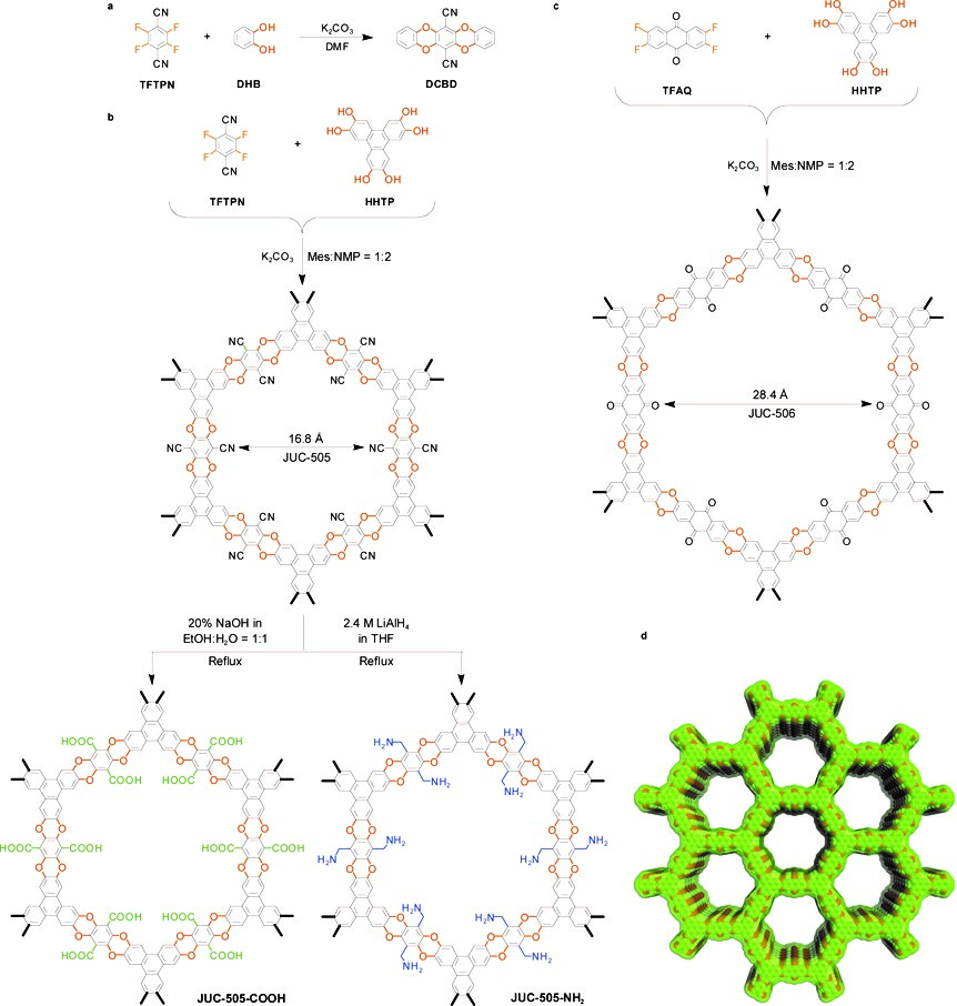 该工作采用邻二酚类单体和邻二氟苯类单体在碱性条件下通过溶剂热的方法合成了两种通过芳香醚键连接的新型共价有机骨架材料(PAE-COFs)并分别命名为JUC-505和JUC-506。