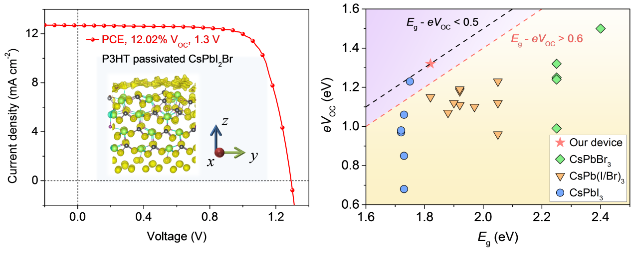 该团队利用一种廉价易得的聚合物—聚噻吩(P3HT)作为空穴传输层,发现其能够有效的钝化钙钛矿的表面缺陷。通过优化,获得最高Voc为1.32V,能量损失仅为0.5 eV,是目前所有无机钙钛矿电池器件的最低能量损失。最终获得了器件PCE达到12.02%,这是报道时基于无机混合卤素钙钛矿电池的最高光电转化效率。并且钝化后的电池器件稳定性明显提升,经过近1000小时的老化依然维持着初始效率的90%。这种方法对于将来减小无机钙钛矿电池的能量损失,继续提高器件性能具有重要意义。