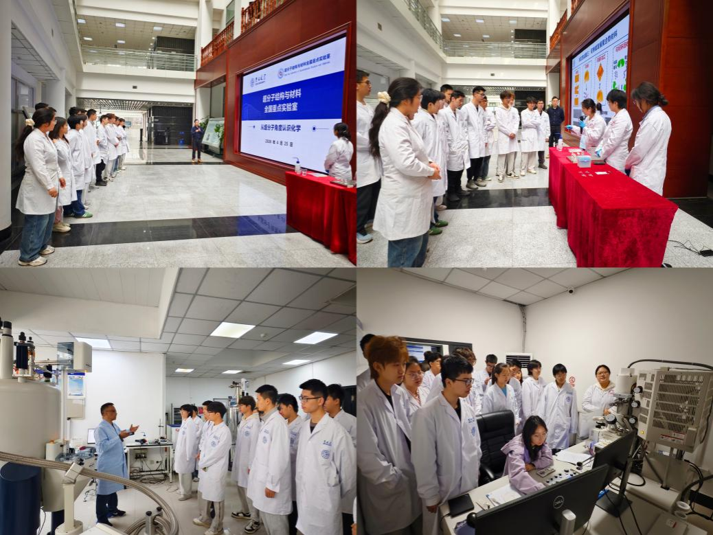 活动伊始,同学们走进超分子结构与材料全国重点实验室。讲解老师从超分子化学的专业视角出发,系统介绍了实验室的建设历程与科研攻关方向,并生动阐释了化学作为“中心学科”,如何成为社会创新的基础引擎与产业升级的核心驱动力。在参观环节,同学们不仅近距离观摩了可降解水溶塑料及其耐水改性技术等代表性科研成果,还实地参观了核磁共振波谱仪等大型仪器设备。通过科研成果与实验平台的双重视角,同学们对化学前沿研究与应用实践有了更为具象且深入的理解。