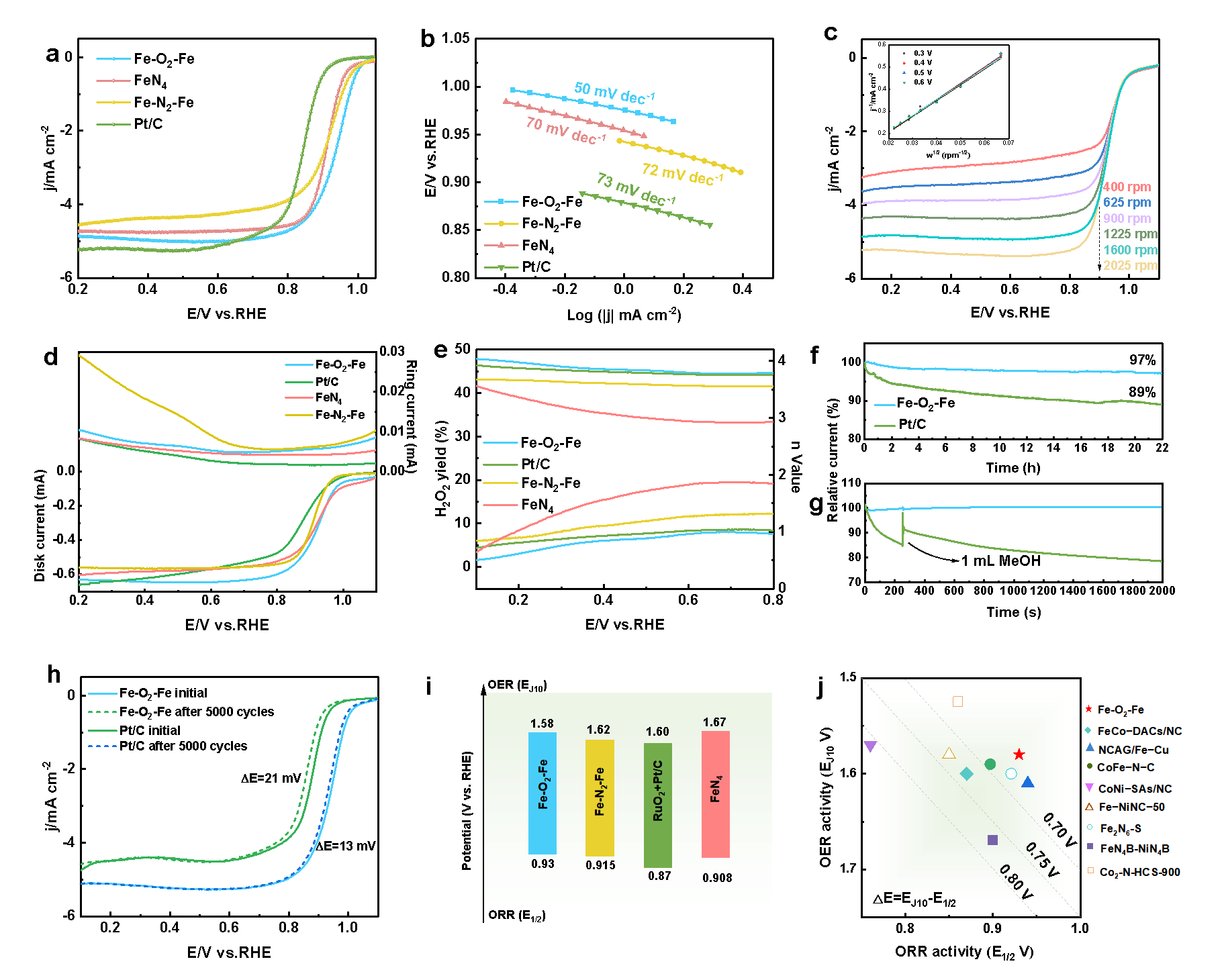 氧还原反应是锌空气电池(ZABs)、燃料电池等众多储能转换系统的关键过程,在可再生能源转化过程中起着至关重要的作用。近年来,单原子催化剂(SACs)因其具有几乎完全的原子效率、独特的电子结构、均匀的活性位点和不饱和的配位环境等优点而受到广泛关注。其中,具有活性FeN4位点的单原子Fe-N-C催化剂因其显著的活性和4e-选择性而被认为是理想的ORR电催化剂,但仍存在两个主要挑战。目前报道的Fe-N-C催化剂大多与电负性很强的N原子配位,导致金属种类的多样性受限,配位环境单调,极大地阻碍了电子结构的调制程度,阻碍了内在催化性能的提高。此外,Fe-N-C中的单个活性位点通常只能与ORR中间体(例如OOH*和O2*)的一个氧(O)原子结合,这导致了对反应中间体(例如OH*)的后续解吸不利的环境。DAC具有吸附的桥位,从而调节复杂中间体的吸附和解吸。此外,在DAC中构建杂原子桥可以调节电子结构,增强电子导电性,从而提高其催化性能。Fe的电子自旋态可以通过在Fe SACs中加入第二个相邻金属原子和改变Fe2DAC的桥接杂原子来调节,从而调节ORR/OER催化活性。然而,由于合成策略的限制,精确调节DACs的配位构型仍然是一个挑战,并且在原子尺度上阐明相邻金属位之间的合作相互作用仍然是一个未解决的问题。