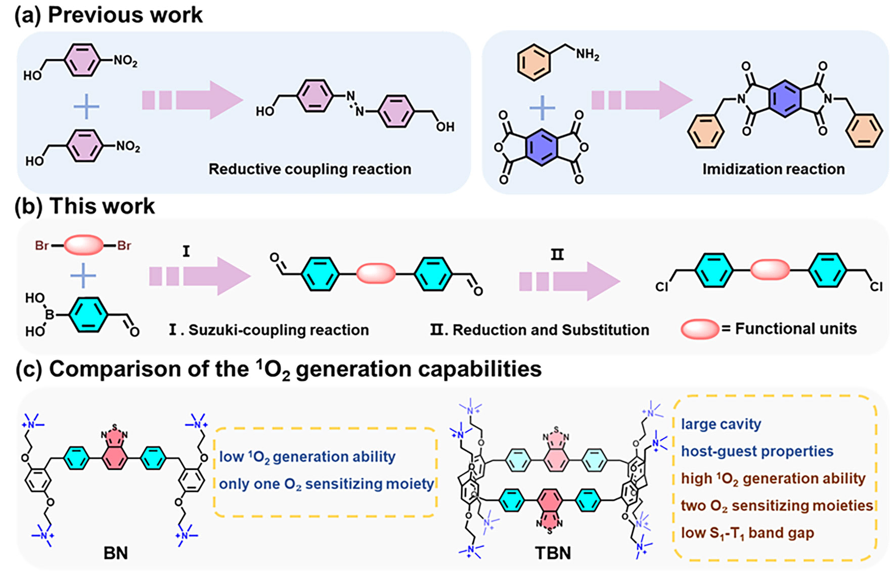 荧光大环分子因其独特的发光性能和可调控的多功能性,一直是新材料和生物医药研究领域的热点之一。它们不仅能用于荧光成像,还在药物递送和疾病诊疗等方面展现出广阔的应用前景。开发可调控其在光照条件下产生活性氧(ROS)能力的新技术变得尤为重要,因为ROS正是光动力抗菌和治疗中的关键活性因子。