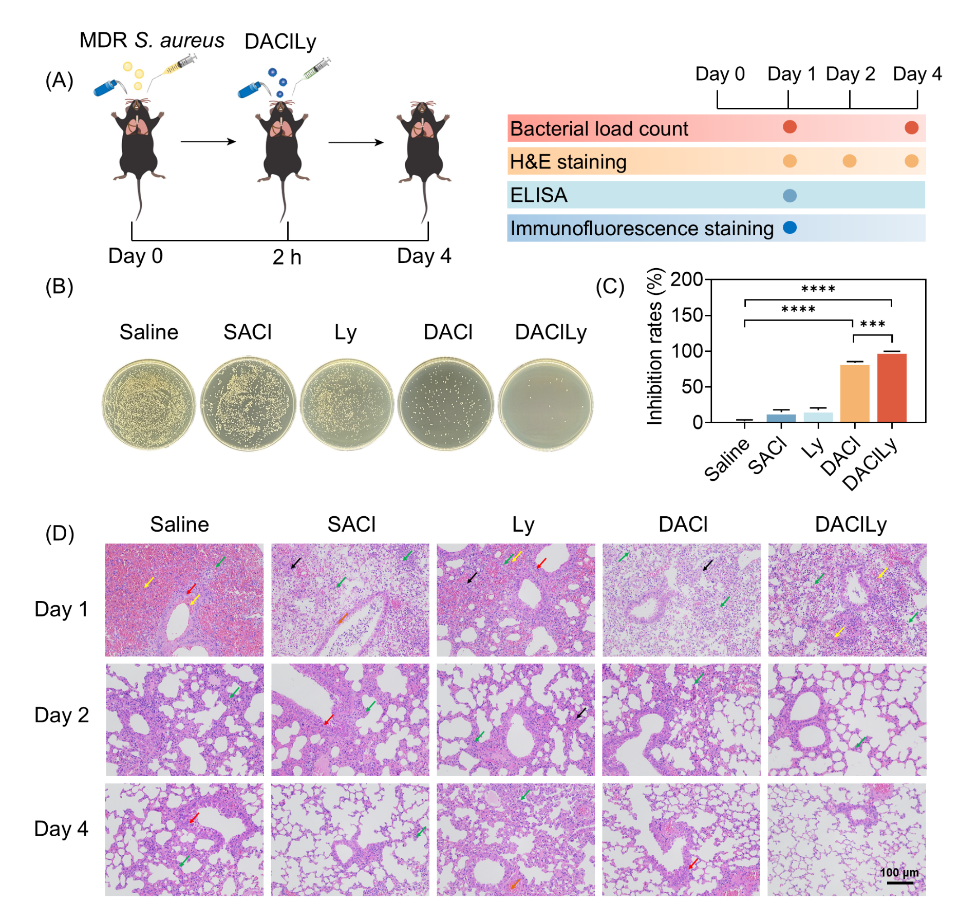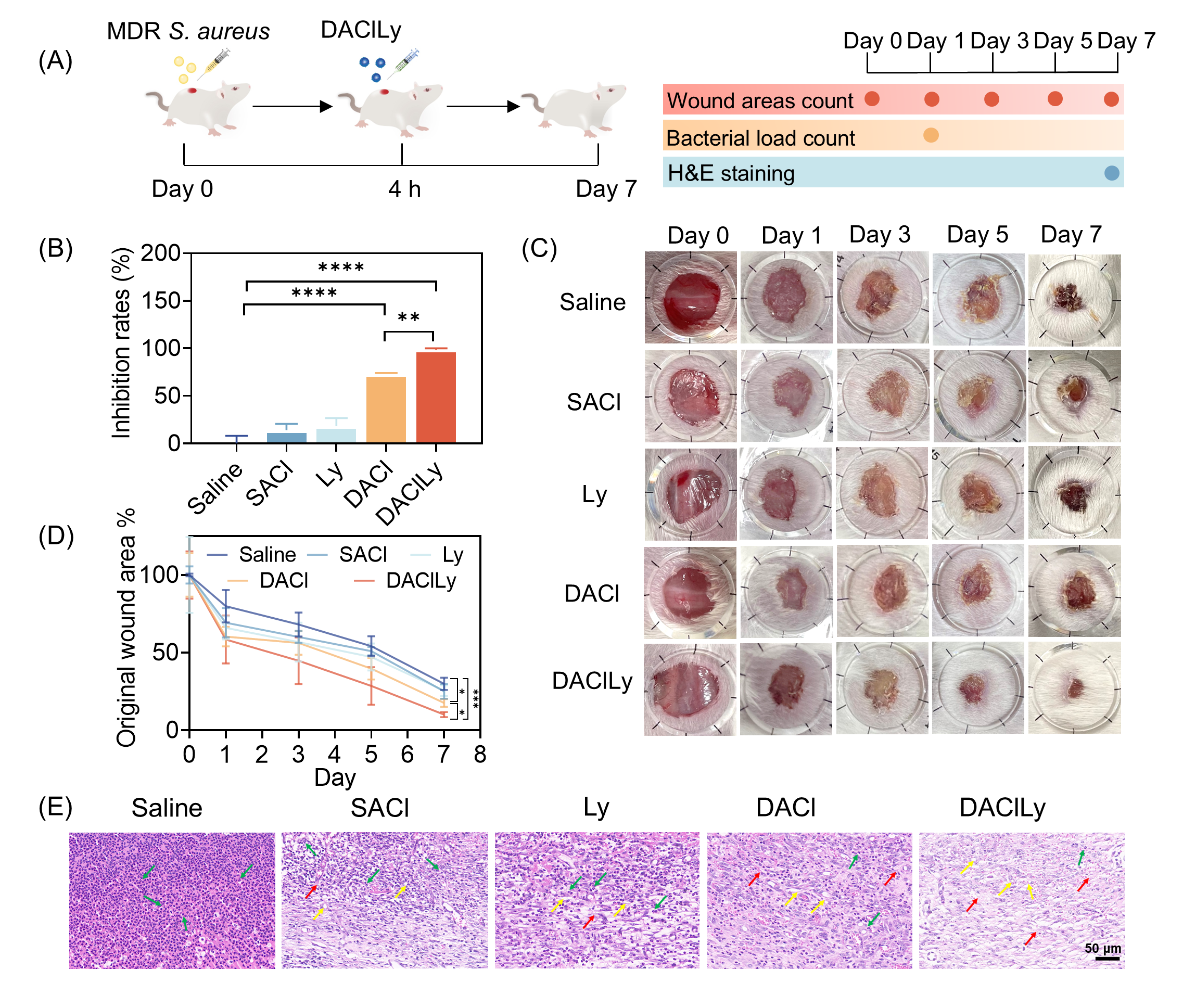 实验结果表明,DAClLy纳米囊泡在体外对多种耐药金黄色葡萄球菌均表现出显著杀菌活性,且在酸性条件下其杀菌效率远高于单一组分或其他对照组。此外,这种材料不仅能预防生物膜形成,还对已形成的成熟生物膜具有强大清除能力,杀菌率超过99%,克服了传统疗法对生物膜渗透性差、效果欠佳的局限。(图2)。