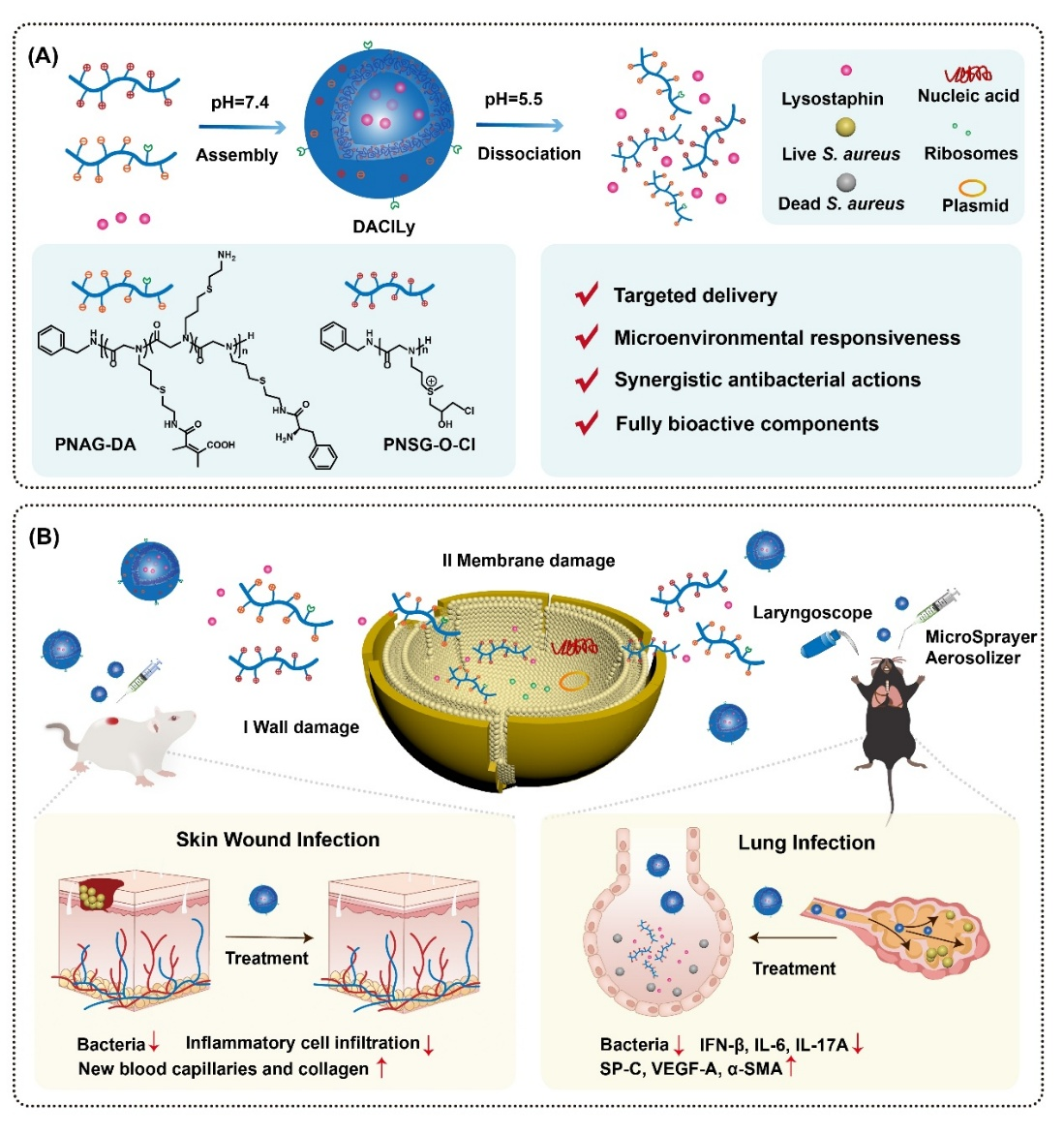面对这一难题,吉林大学陈学思院士和孙静教授研究团队设计了一种简洁、高效的策略,通过集成多种协同抗菌组分,成功开发出一种新型智能纳米囊泡抗菌平台-DAClLy,有效借助组分间的协同增强效应,不仅在细菌感染部位实现精准富集与智能释药,更通过多重机制协同抗菌,高效清除耐药菌和生物膜,大幅提升杀菌效率。这一策略有效克服了传统单机制给药的局限性,其简洁高效的设计,为临床耐药菌感染治疗提供了新的治疗解决方案,也为应对全球健康威胁提供了一条具有转化前景的可行路径。