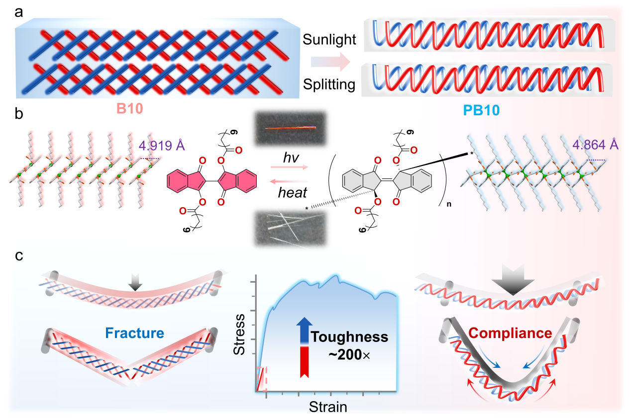 有机晶体材料在柔性电子、仿生器件等领域展现出巨大应用潜力,然而其力学性能的固有矛盾长期制约着实际应用——高强度往往伴随着脆性断裂,而优良的柔韧性又通常以牺牲承载能力为代价。这一“强度-韧性权衡”难题成为该领域发展的关键瓶颈。针对这一挑战,吉林大学张红雨教授团队开创性地发展了可见光驱动的单晶到单晶光聚合策略,在分子水平上实现了晶体结构的精准重构,成功打破了有机晶体材料力学性能的固有局限。