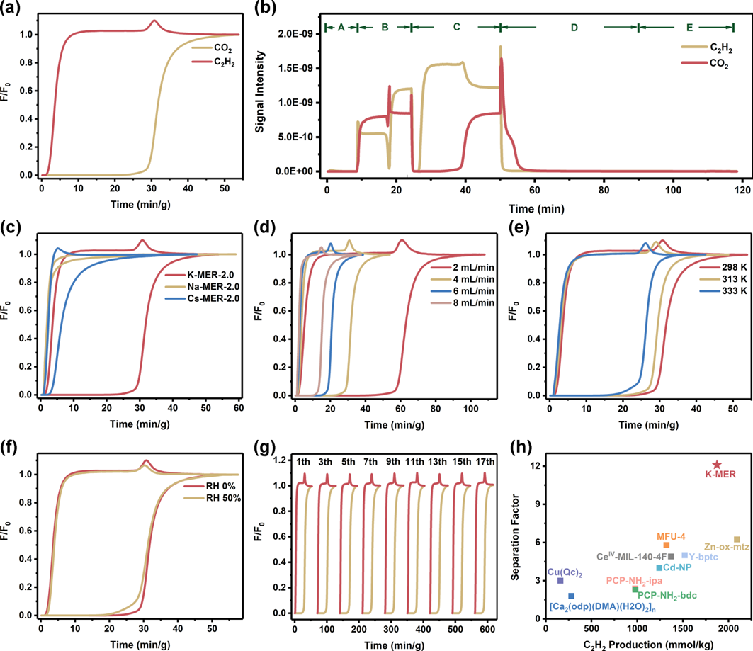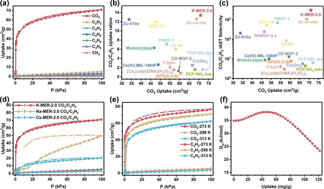 针对上述问题,吉林大学宋晓伟教授和梁志强教授课题组联合天津工业大学梅东海教授,报道了一种无需有机模板合成的柔性沸石材料K-MER-2.0(硅铝比为2.0),其在298 K和101 kPa条件下具有显著的70.9 cm3/g的CO2静态吸附容量,优于其对烃类的吸附容量(C2H2: 5.3cm3/g, C2H4: 1.3 cm3/g, C2H6: 0.6 cm3/g, C3H6: 2.7 cm3/g, C3H8:3.3 cm3/g, CH4: 0.04 cm3/g),从而展现出卓越的CO2/烃类分离性能。该材料在CO2/C2H2(体积比50/50)混合物中的理想吸附溶液理论(IAST)选择性达到了3056。值得注意的是,K-MER-2.0在穿透实验中能够一次性纯化乙炔,且纯乙炔(99.6%)产量高达1872 mmol/kg,从而无需多阶段解吸过程,并且为CO2/C2H2反分离吸附剂提供了新的基准。