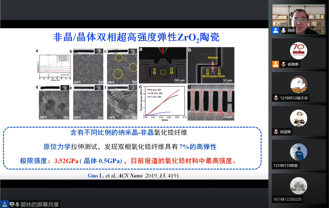 讲座中,郭林教授围绕无机非晶微纳米材料的可控合成及相关特性深入浅出地分享了其课题组在非晶微纳米材料普适制备方法,无机非晶微纳米材料光学特性、催化特性,非晶微纳米材料的力学特性及其在牙修复中的应用等方面的研究进展,展现了无机非晶微纳米材料的研究前沿及广阔的应用前景。在交流互动环节,郭林教授耐心详细地解答了院内外师生的问题,并对相关领域的发展出了展望。四虎影视